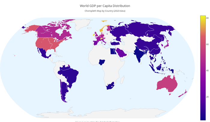 This example demonstrates creating professional geographic data visualizations using choropleth maps to show statistical data across countries. It visualizes world GDP per capita distribution using color-coded country regions with interactive hover information and detailed geographic styling.