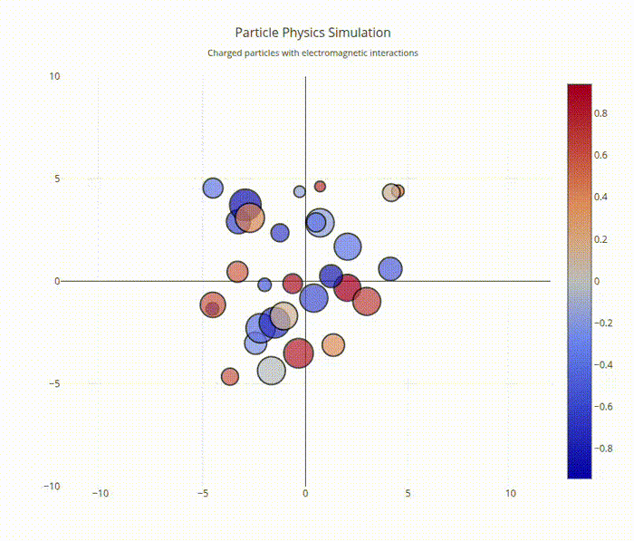 This gallery example demonstrates an advanced real-time physics simulation using Plotly.cpp. It simulates charged particles with electromagnetic interactions, collision detection, and realistic physics behavior in a bounded environment.