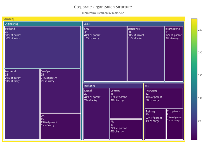 This gallery example demonstrates creating an interactive hierarchical treemap using Plotly.cpp to visualize corporate organizational structures. Treemaps excel at showing hierarchical data with proportional area representation, making it ideal for organizational analysis and resource allocation visualization.